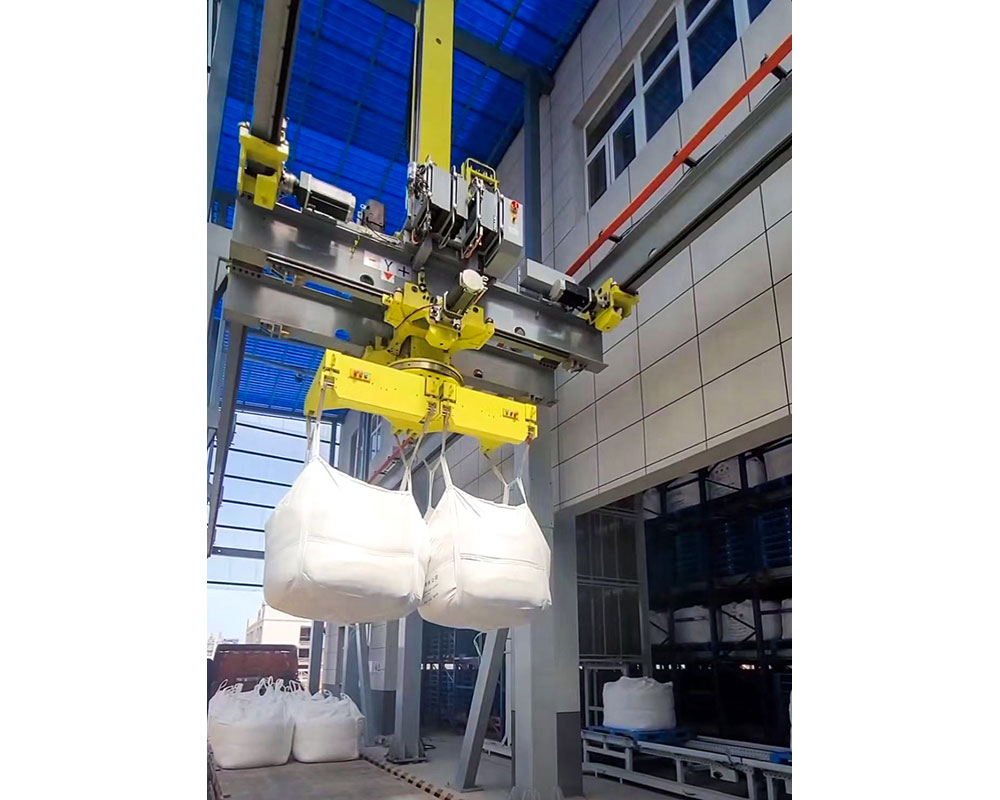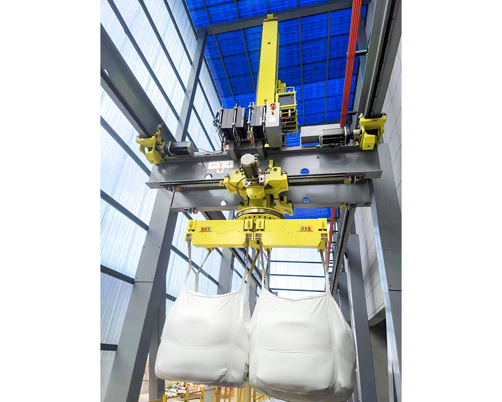 T200空間物流桁架機器人配合噸包袋抓手,智能感知車輛位置,自動進行車輛掃描,智 能化設計垛型并自動完成裝車工作,實現(xiàn)單次2包,一小時80包快速裝車。