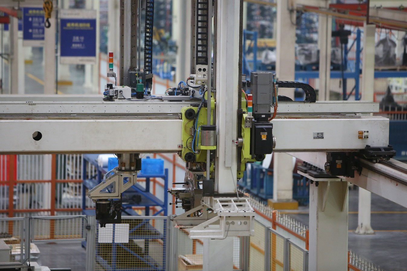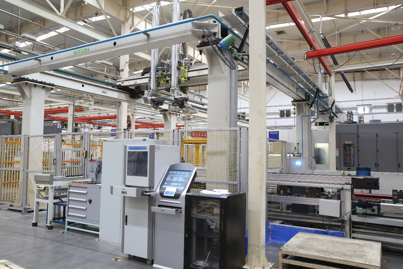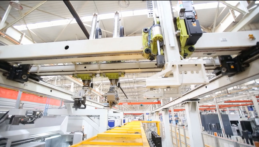 客車減速器殼體桁架機(jī)器人FMS線由1套三軸桁架機(jī)械手、2臺(tái)臥式加工中心、1臺(tái)立式加工中心、夾具庫(kù)、輸送料倉(cāng)、裝配機(jī)及產(chǎn)線管控系統(tǒng)組成,實(shí)現(xiàn)多品種小批量零件的自動(dòng)上下料、夾具自動(dòng)柔性切換。